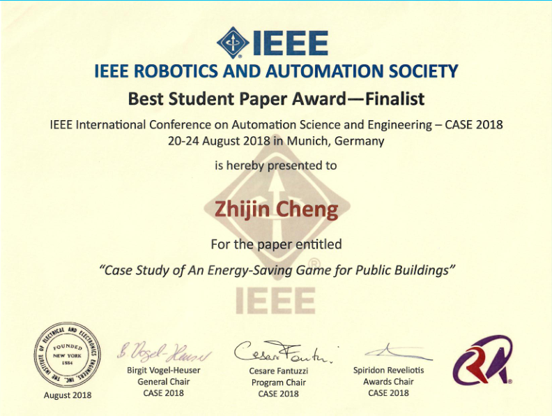 近日,北京泰豪博士后程志金應(yīng)邀赴德國慕尼黑參加14th IEEE Conference on Automation Science and Engineering(自動化科學與工程國際會議)大會,并做大會報告。程志金博士的研究成果“Case Study of An Energy-Saving Game for Public Buildings”經(jīng)過多輪激烈比拼和專家評審,成功入圍國際自動化領(lǐng)域的高水平旗艦學術(shù)會議IEEE Conference on AutomationScience and Engineering的最佳學生論文(4/2000)。一同入圍的還有世界知名高校和研究機構(gòu):加州大學伯克利分校、魯汶大學、中科院。